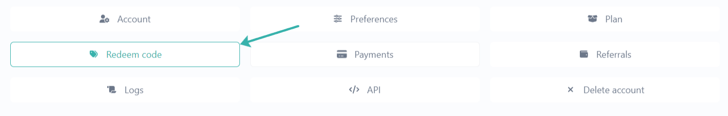 If you have a discount code, you can redeem it for a discount on a particular plan. This can be useful to get a discount on signup or upgrade. To redeem your code, navigate to your account page, then click “Redeem code” at the top of the page. See Edit Account Settings.