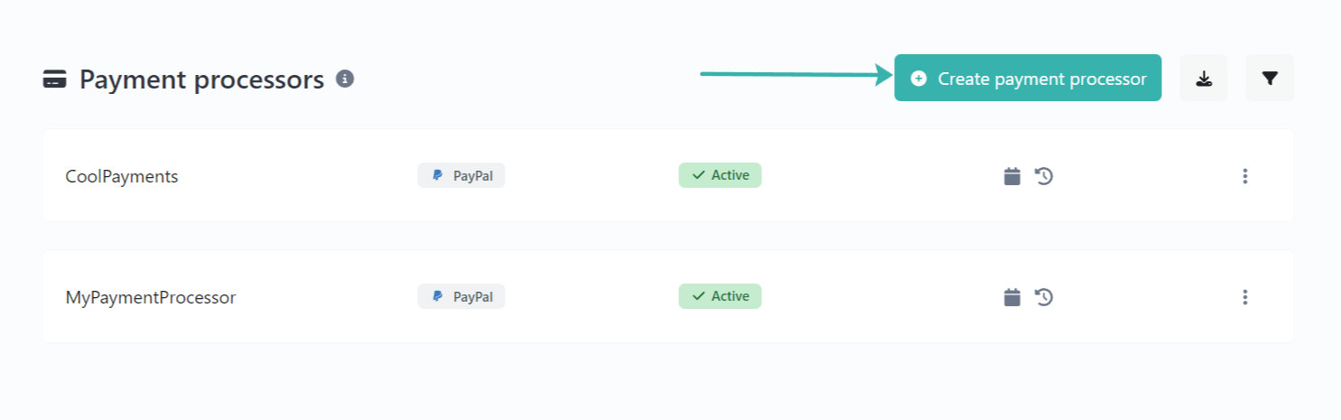To create a new payment processor, click on “Create payment processor” in the top-right corner.