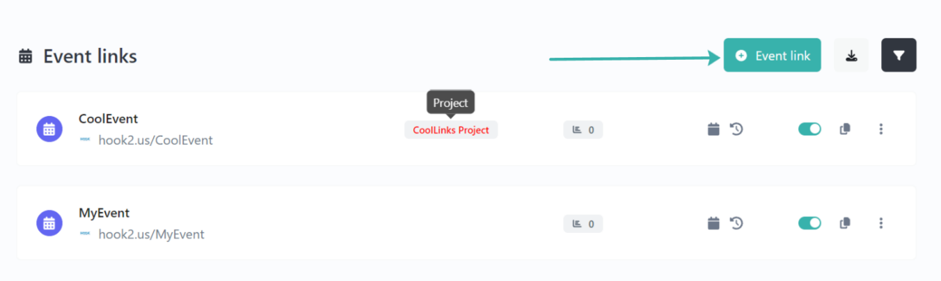 - Event link name: The name of your event link. Clicking this will allow you to change settings for the link.