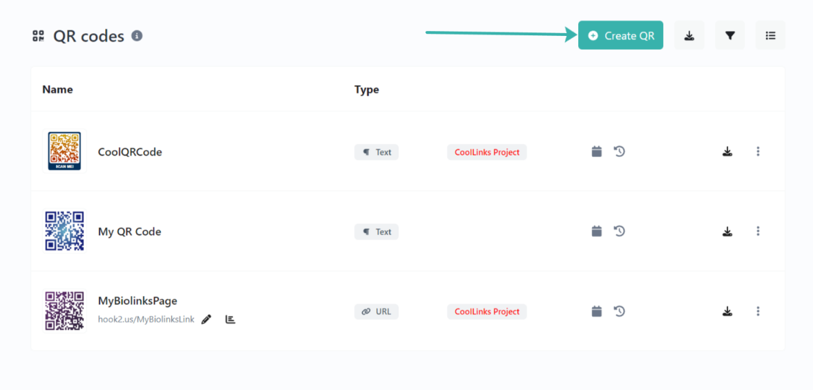 - Project: Assign the QR code to a Hook2.us project so you can keep track of data from many resources together. You can click “Create project” to create a new project from here.