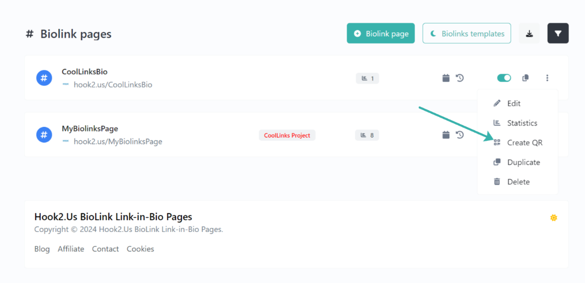 You can create a QR code for many Hook2.us resources, such as biolinks, vCards and static sites. To do so, navigate to the resource you wish to have a QR for. On the right side of the page next to the resource you want to use, click the three dots and then click “Create QR.”